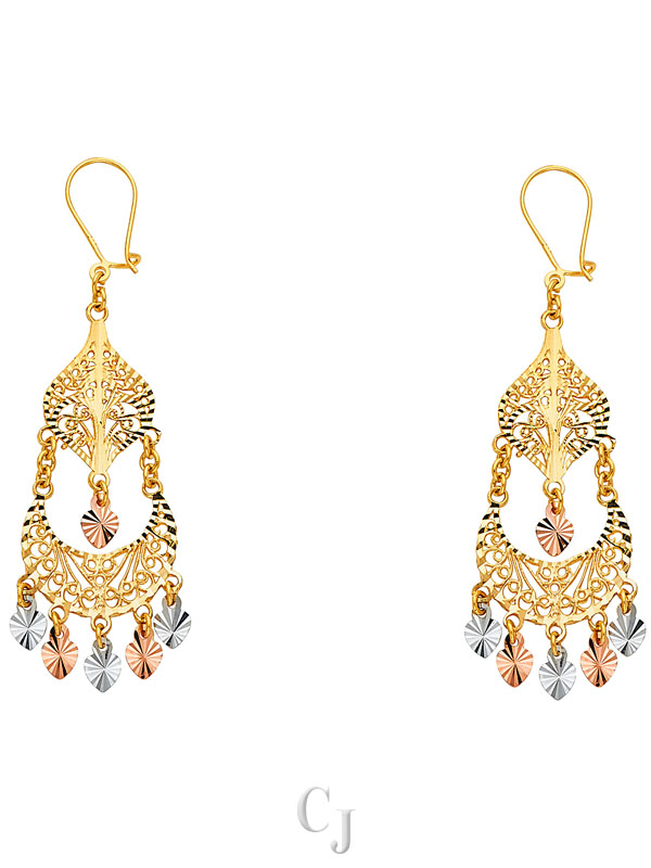Add graceful movement and color to your look with our 14K tri-color hanging earrings. Featuring a delicate blend of white, yellow, and rose gold, these earrings offer a unique and elegant style. Perfect for both day and evening wear, they bring charm and versatility to any outfit.