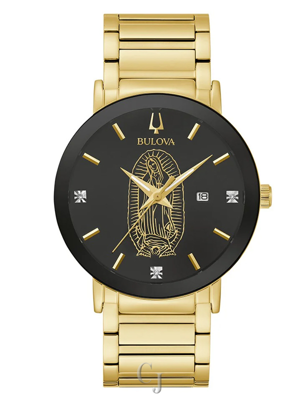 Experience timeless sophistication with the Bulova Gold-Tone Guadalupe Dial Men’s Watch. Designed for discerning gentlemen, this exquisite timepiece features a gold-tone stainless steel case adorned with a striking Guadalupe outline and three shimmering diamonds on the gold-tone dial. The watch offers practicality with a three-hand date function, a metalized edge-to-edge curved crystal, and a durable screw-back case. Paired with a gold-tone stainless steel bracelet and secure deployment closure, this watch exudes luxury and elegance. Perfect for elevating your style, this piece is a true testament to refined craftsmanship.