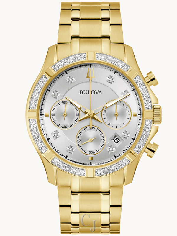 This men’s six-hand chronograph from the Bulova Classic collection balances sporty flair and timeless luxury. Encased in gold-tone stainless steel, its sleek silhouette exudes sophistication, further elevated by the presence of 24 dazzling diamonds meticulously set in the bezel. The tiered silver-white dial commands attention with 8 diamond markers, alongside a date and three sub-dials showcasing running seconds, chronograph minutes, and chronograph 1/20 seconds. The timepiece is paired with a gold-tone stainless steel bracelet with a double press deployant buckle closure providing a secure fit. Designed to accompany a luxurious lifestyle, this Bulova men’s timepiece is an indispensable part of any discerning collection.