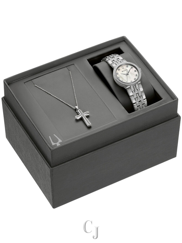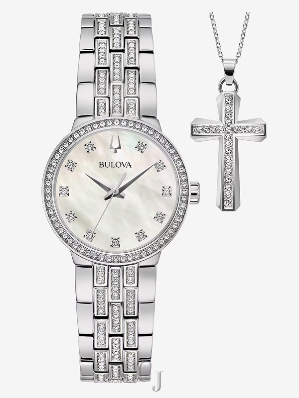 This elegant ladies’ box set from Bulova’s Crystal collection embodies timeless sophistication. The silver-tone stainless steel case effortlessly blends feminine allure with contemporary flair, featuring a bezel adorned with shimmering crystals for a touch of glamour. The luminous mother-of-pearl dial showcases crystal hour markers and refined silver-tone accents, adding to its enchanting appeal. Complementing the case and dial, crystals embellish the silver-tone stainless steel bracelet, while its fold-over buckle closure with safety and pushers ensures a secure and comfortable fit. Included in this exquisite set is a cross pendant crafted from silver-tone stainless steel, adorned with crystals spanning from end to end. With its impeccable design, this box set offers a refined timepiece suitable for any occasion, exuding charm and sophistication effortlessly.
