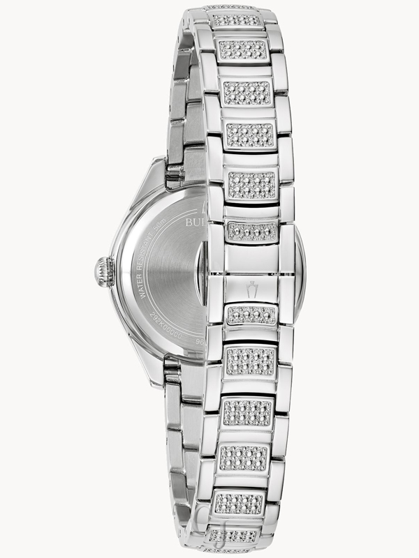 This new addition to the Bulova ladies’ Crystal collection balances a dressy aesthetic with sporty versatility. The silver-tone stainless steel case has a sweeping polished bezel fully set with dazzling crystals that complement the dial and bracelet, a total of 128 crystals providing sparkling beauty on the wrist. The opalescent mother-of-pearl dial features silver-tone hands with luminescent fill, polished silver-tone roman numerals, and hand-set crystal hour markers. The watch is complemented by a silver-tone stainless steel bracelet adorned with crystals, with a deployant push-button closure. Set with 128 crystals, this women’s Bulova timepiece expresses a radiant beauty.