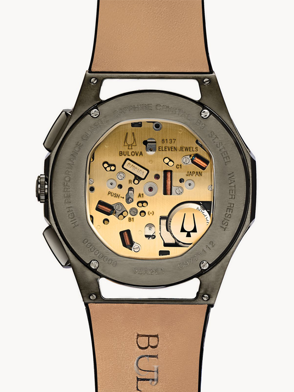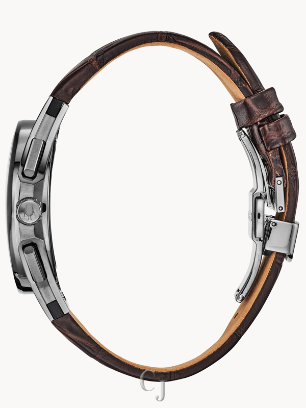 The world’s first curved chronograph movement features high-performance quartz technology with 262 kHz vibrational frequency for precise accuracy. Five-hand chronograph in a gray stainless steel case with black and transparent brown dial, gray hands and markers, anti-reflective curved sapphire crystal, exhibition case back with screw-back case, brown leather strap with an alligator grain texture and double-press deployant closure. Water resistance to 30 meters.
