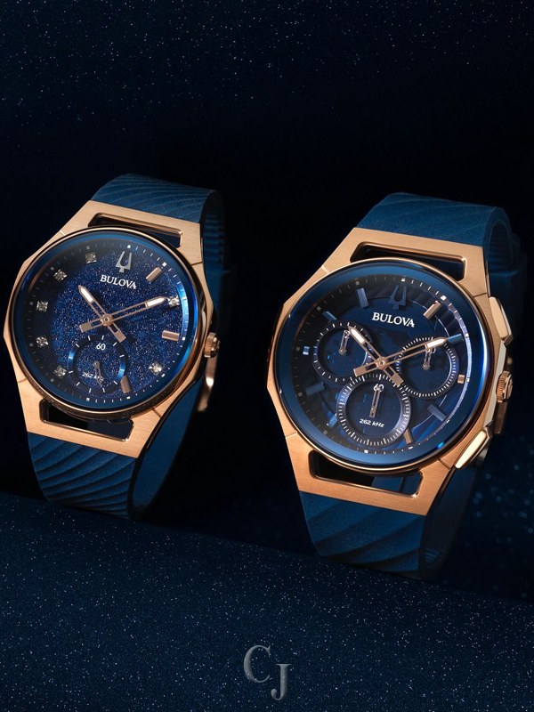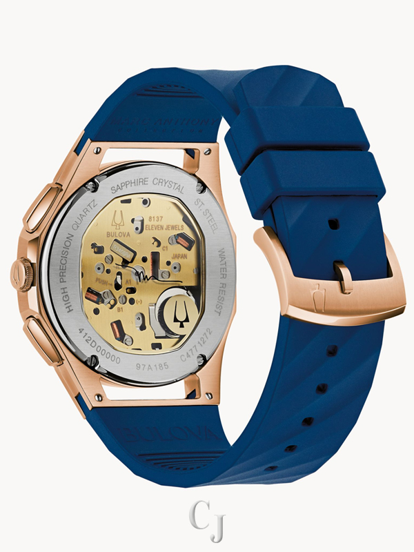 Seamlessly merging iconic Bulova watch designs with the dynamic musicality of Marc Anthony, this new addition to the Marc Anthony collection puts the legendary artist’s spin on the groundbreaking men’s CURV chronograph. With a rose gold-tone stainless steel case with open lugs and pushers, the CURV features the world’s first curved chronograph movement, with a dramatic curved sapphire crystal and a curved case back that gives it an effortless presence on the wrist. Mirroring the bold rhythm of Anthony’s music, the translucent blue five-hand chronograph dial brings a refreshing palette to the CURV collection and offers a glimpse at the curved chronograph movement featuring our proprietary high-precision 262 kHz quartz technology with exceptional accuracy of seconds per year. The 1, 3, and 5 hours marked by applied rose gold-tone markers highlight Marc’s personally significant numbers. Three sub-dials display the elapsed chronograph time in 12-hour, 60-minute, and 60-second intervals. The chronograph 60-second sub dial at 6 o’clock doubles as the standard second hand; the dual mode is actuated by the 4 o’clock pusher. Paired with a matching blue silicone strap with a rose gold-tone pin buckle, the new Bulova x Marc Anthony CURV is a demonstration of Marc Anthony’s musical range and cross-generational appeal that sets a new standard for inspired timekeeping.