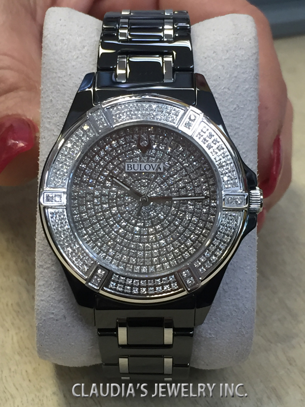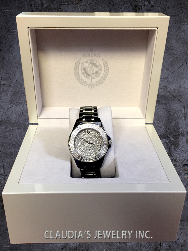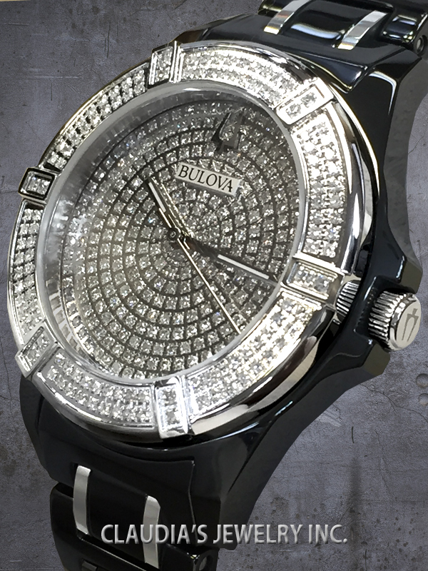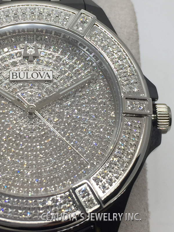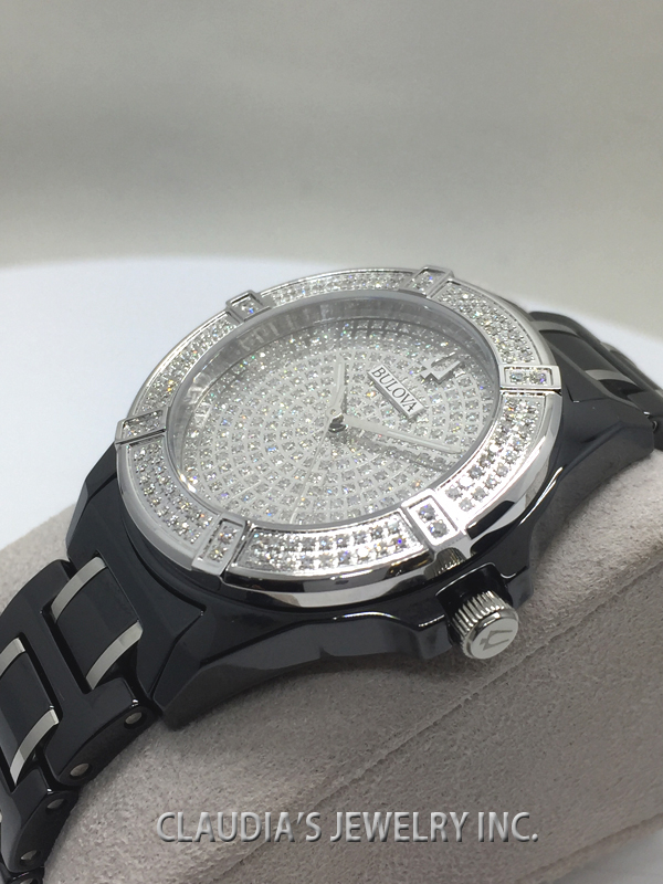 Bulova celebrates its legacy of innovation with the release of the Limited Edition Bulova with Black- Ceramic & Stainless steel case 37mm, 390 diamonds 1.99 ctw Si2 individually hand set on on dial and bezel, Full Paved Diamonds dial, sapphire glass, black ceramic bracelet with silver-tone accents and double-press deployment closure, and water resistance to 100 meters.