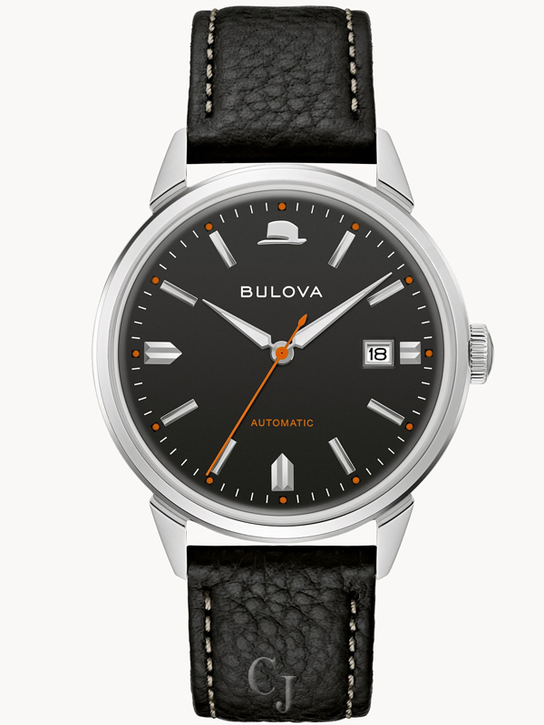 Be impeccably dressed with a Frank Sinatra timepiece on your wrist. Incorporating vintage Bulova designs with the iconic elements of the legendary performer, ‘Summer Wind’ is the newest addition to our collection of timepieces that pay tribute to Frank Sinatra’s most famous songs. This collector’s watch has a cool elegance like Sinatra himself and features a silver-tone stainless steel case, silver-tone hands and markers, and a black dial with orange accents – “Orange is the happiest color,” Sinatra once said. It also features a self-winding 21-jewel automatic movement with a 42-hour power reserve and calendar. Sinatra’s classic fedora is displayed on the dial, finished with a domed sapphire crystal with AR coating. The exhibition case back showcases the fine movement, as well as the song title and fedora hat. The black textured leather strap with stitching detail is stamped with the song title along the inside and features a double-press deployant buckle closure. Water resistant to 30 meters.