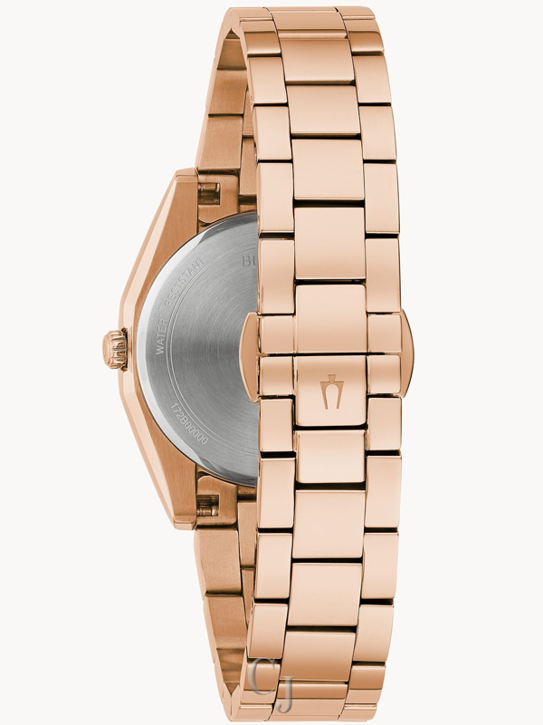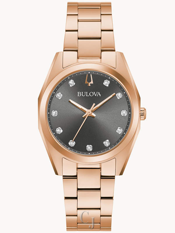 The classic Surveyor line from Bulova has been updated with a Dress Sport ladies watch. This rose-gold watch has a stainless steel case and bracelet with an elegant flair. The sunray grey dial is hand set with 11 diamonds for both the look and feel of a luxury watch. This quality timepiece is well-made and beautifully detailed, making it an elegant addition to any collection.