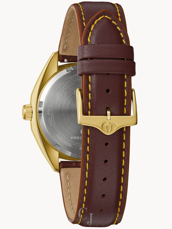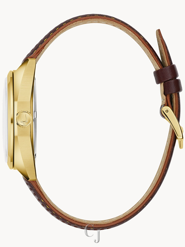 Straight from the 1970s comes the Bulova 1973 Jet Star, an iconic model from the brands impressive history, now equipped with an equally impressive movement. Borrowing from its historic forebear, the gold-tone stainless steel case features a striking angular design with broad facets and a domed sapphire crystal. The warmth of the butterscotch sunburst dial is accented by a rich brown chapter ring, applied brown and gold-tone hour markers, and gold tone hands. Luminescent plots at each hour and fill in the hands allow for exceptional legibility in every environment, while a date display sits perfectly at 3 o’clock. A red seconds hand brings a pop of color and sweeps smoothly around the dial thanks to Bulova’s Precisionist movement, a revolutionary 8-jewel quartz mechanism vibrating at a remarkable 262kHz and accurate to 5 seconds per month with increased resistance to temperature changes. The Bulova 1973 ‘F’ Jet Star is paired perfectly with a brown leather strap with latched spring bars for easy release. Strut your stuff in legendary style with the high-flying Bulova 1973 Jet Star, a legendary design recreated for the modern connoisseur.