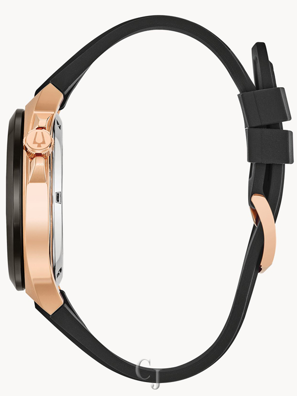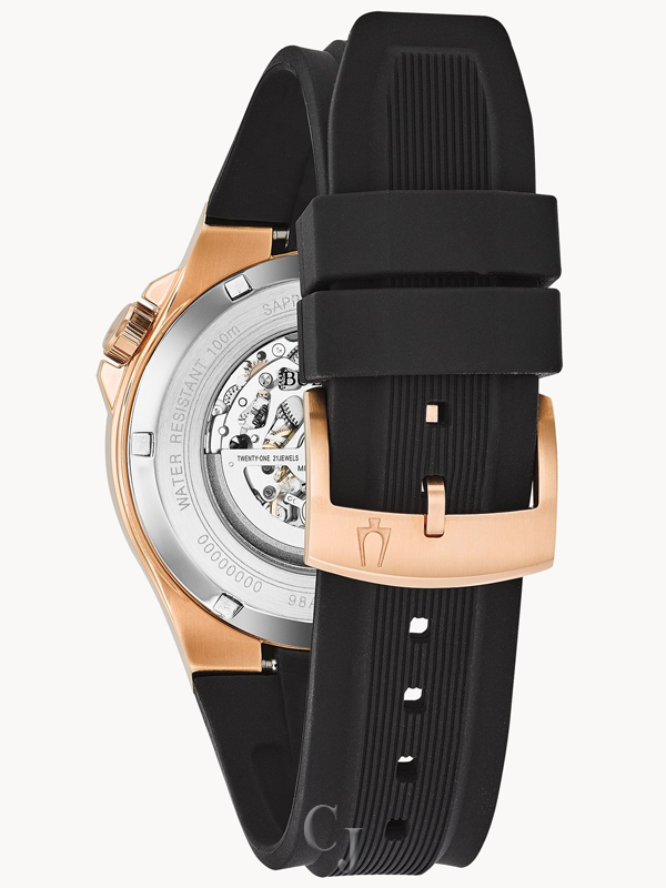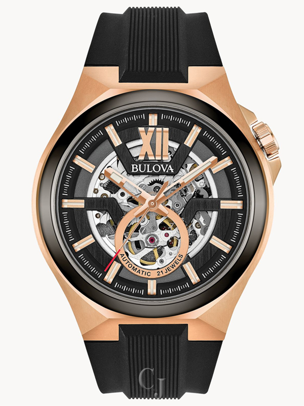 From the Classic Automatic Collection. New Sport style in rose gold-tone and gun stainless steel case, open aperture black dial with rose gold-tone accents and black inner dial ring, exhibition case back, skeleton automatic movement with 40-hour power reserve, sapphire glass, matte black silicone bracelet with buckle closure, and water resistance to 100 meters.