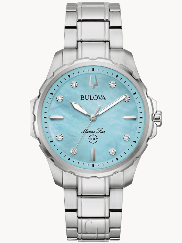 From the legendary Bulova Marine Star collection, this elegant ladies’ timepiece offers unrivaled style. The silver-tone stainless steel case features a modern design with a bold crenellated fixed bezel and symmetrical case flanks. A flat sapphire crystal and protected crown provide modern reliability which is furthered by 100m of water resistance. The lustrous blue mother-of-pearl dial adds a splash of color to the timepiece, with eight diamond hour markers and a refined handset with luminescent fill for superb legibility in all conditions. The watch is paired with a dual-finished silver-tone quick-release stainless steel bracelet with a push-button deployant closure that provides both comfort and security. For timeless elegance no matter the occasion, this Bulova ladies’ timepiece makes the perfect companion.