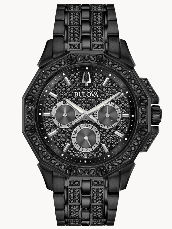 Multi-function dress watch boldly embellished with 300 crystals on the black tone stainless steel case and bracelet with a pave set black dial. Water resistance to 30 meters.
