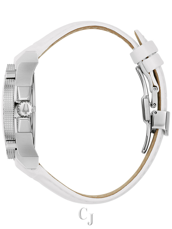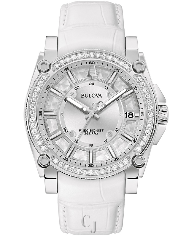 The latest model from the Champlain collection is a stunning interpretation of modern design, powered by Bulova’s most advanced movement technology. Distinguished by angular lines and pronounced facets, the 40mm silver-tone stainless steel case features a bezel hand-set with 52 dazzling 1.5mm full-cut diamonds totaling .79 ctw. The case is fitted with a curved sapphire crystal and has 100m water resistance. A radiant silver-tone dial features grooved texturing and is segmented by applied silver-tone hour markers, with silver-tone hands with luminescent fill. The sweeping seconds hand features the signature ‘P’ counterbalance, denoting the Bulova Precisionist movement that powers the timepiece. The Precisionist movement is a revolutionary 8-iewel guartz mechanism accurate to 5 seconds per month and with increased resistance to temperature changes. Complementing the design is a white crocodile grain leather strap with a push-button deployant clasp. Embrace a new level of elegance with this stunning timepiece from the Bulova Champlain collection