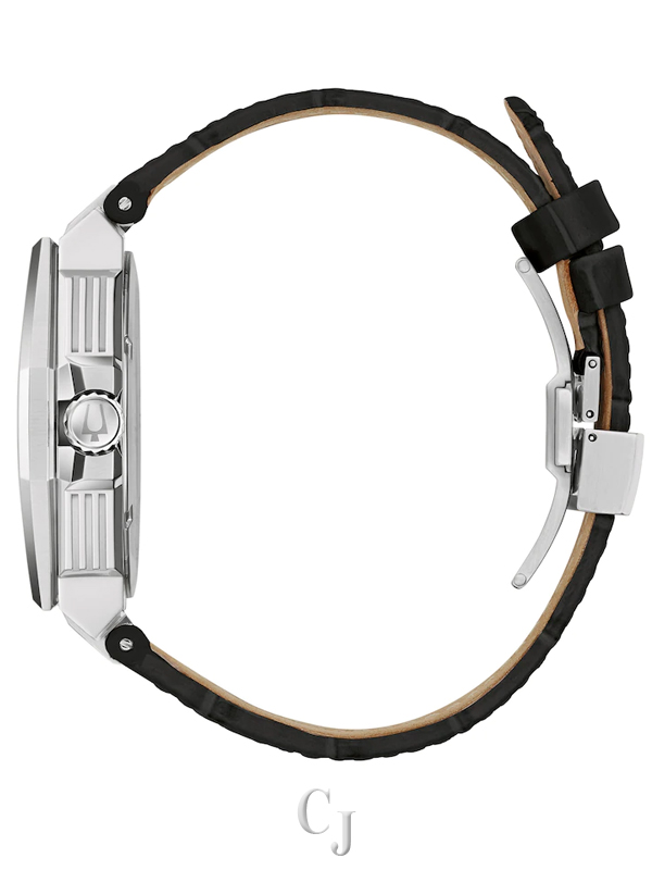 Set in a 45mm stainless steel case, this men’s watch from the Precisionist Collection with precise timing to 1/1000th of a second and continuous-sweep second hand is particularly refined. The black dial has luminescent hands and hour markers, diamond bezel, and a stylized date window that completes the look. A curved mineral crystal protects the dial, while a deployment buckle clasp secures the black leather strap. The men’s watch is water-resistant to 300 meters.
