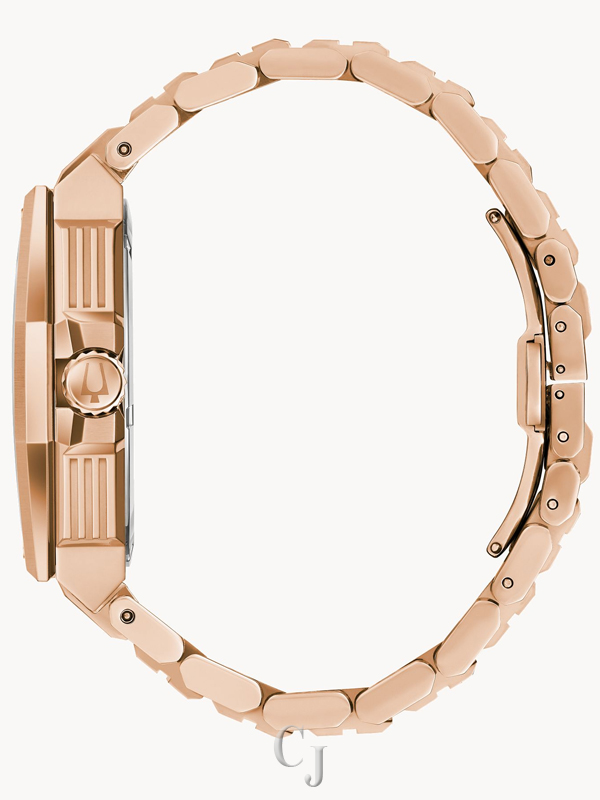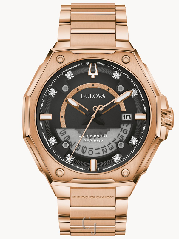 With its distinctive masculine architectural design elements and rose gold-tone stainless steel case and bracelet, this new Precisionist X Diamond men’s watch makes a bold first impression. The black, 3-hand dial with an exhibition calendar window, features 8 elegantly placed hand-set diamonds and is finished with a curved sapphire crystal. The bracelet has a deployant clasp with pushers for easy release. This luxurious timepiece is water resistant up to 100 meters and is powered by Bulova’s proprietary high-performance 262kHz 3 hand calendar movement. Take your precision to the next level with this innovative and stylish timepiece, fusing design & technology.