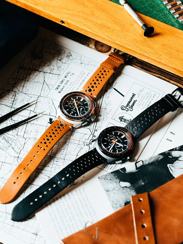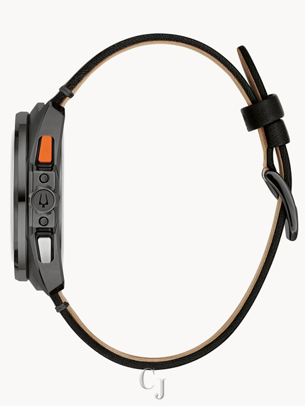 Built on Bulova’s vibrant history in motorsport – from soap box derbies to the upper echelons of auto racing – the new men’s Racer chronograph watch is fine-tuned and designed for performance. The contoured black IP stainless steel case features a unique design evoking the aerodynamic curves of the world’s fastest automobiles. A two-tone orange and black tachymeter ring offers further functionality, while pronounced pushers provide a distinctively automotive aesthetic. The black 5-hand chronograph dial features an orange and white racing pattern chapter ring, with a date display at 6 o’clock and black subdials displaying the chronograph minutes and the 24-hour time. A bold orange chronograph seconds hand ensures optimal legibility no matter the speed. The dial is appointed with applied silver-tone markers and matching beveled hands, all filled with a super-luminous material for low-light visibility. The watch is paired with a perforated black leather racing-style strap with a pin buckle closure. Whether gripping the wheel around the bend at the track or on your daily commute, the Bulova men’s Racer chronograph is a stylish expression of racing history and a passion for speed.
