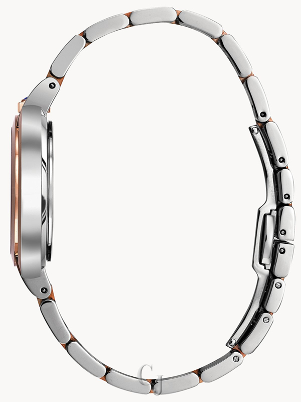 From the Rubaiyat Collection. Legendary heritage reinvented in rose gold-tone and stainless steel case with synthetic blue spinel cabochon crown at 12 o’clock position and eight diamonds individually hand set on textured rose-gold dial, curved sapphire crystal, two-tone rose gold and stainless steel bracelet with double-press deployment closure, iconic dye struck “Goddess of Time” dimensional case back and water resistance to 30 meters.