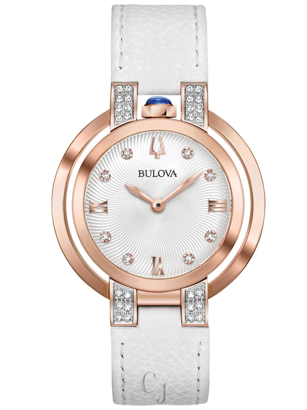 Celebrating the legendary heritage of this iconic watchmaker, this sophisticated watch from Bulova’s Rubaiyat Collection boasts reinvented style that is sure to add a romantic touch to your favorite ensembles. Built in rose gold-tone stainless steel for durability, the 35mm rose gold-tone case houses a reliable quartz movement that keeps you on time for every appointment. The beautiful watch face boasts a patterned silver-tone dial with sleek rose gold-tone hands, Roman numeral markers, and eight sparkling round diamond markers that were individually hand-set, showcasing Bulova’s attention to detail. The synthetic blue spinel cabochon crown in the 12 o’clock position and halo bezel are unique details that add Bulova’s stylish fingerprint to the overall design of the watch. A coordinating white leather strap completes the look and comfortably secures with a double press deployment buckle.