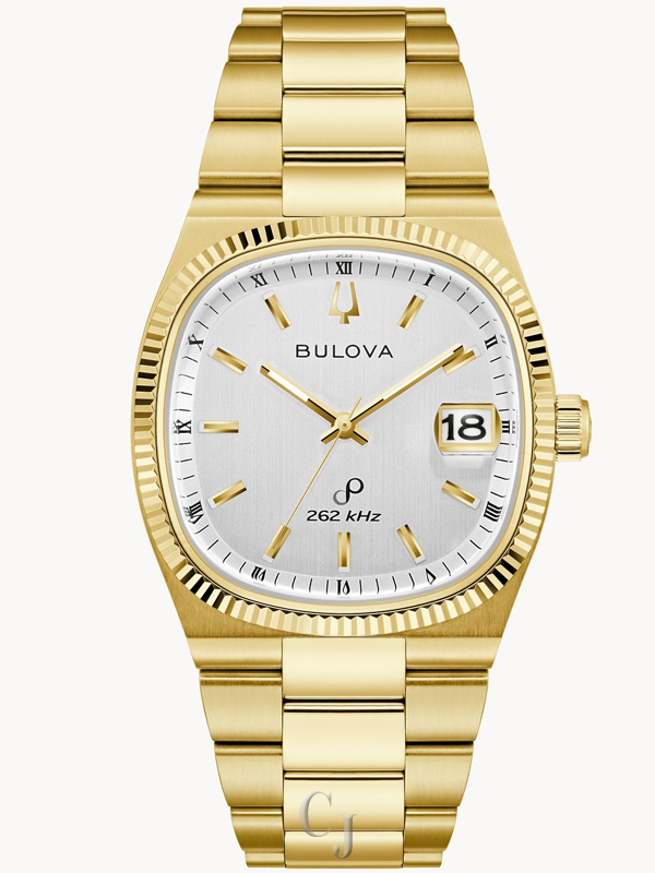 Drawing inspiration from the incredible Bulova Super Seville Day-Date from the 1970s, the new Super Seville merges retro aesthetics with state-of-the-art Precisionist technology for a timeless modern appeal. The gold-tone stainless steel 38mm case has the versatility to be worn by most anyone and makes a bold statement with a seamless silhouette created by the retro TV-shaped case transitioning into the integrated 3-link stainless steel bracelet, which features a secure and convenient push-button deployant clasp. An elegant, grooved coin edge bezel enhances the case and surrounds the flat sapphire crystal and its date magnifier. The sophisticated vertical brushed dial is silver-white with polished hands and indices and a date situated perfectly at 3 o’clock. The new Super Seville is powered by our proprietary high precision quartz Precisionist movement, a revolutionary 8-jewel quartz mechanism vibrating at a remarkable 262kHz, accurate to seconds per year with increased resistance to temperature changes, and with a smooth sweeping second hand. Embrace an effortless kind of elegance with the men’s Bulova Super Seville.