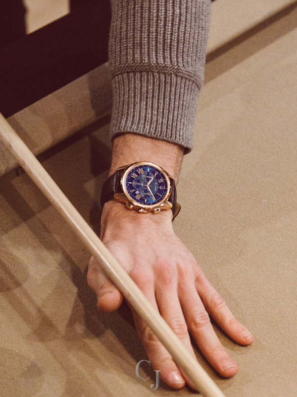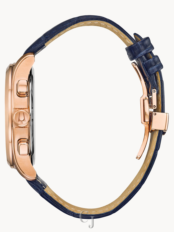 From the Classic Collection. New Wilton style with six-hand chronograph function. Rose gold-tone stainless steel case with applied Roman markers, tachymeter and calendar feature on dark blue textured dial, domed mineral glass, croco-embossed blue leather strap with double-press deployment closure, and water resistance to 30 meters.