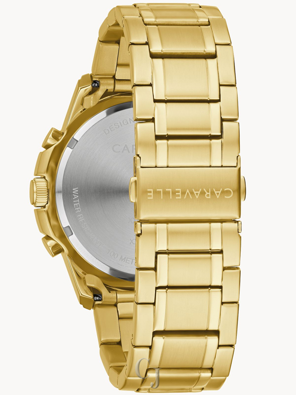 Form and function, no compromise needed. Gold-tone stainless steel case with a uni-directional rotating bezel. Black wave inspired dial texture with luminous hands and markers. Six-hand chronograph movement. Gold-tone stainless steel bracelet with short fold-over closure. Water resistant to 100 meters.