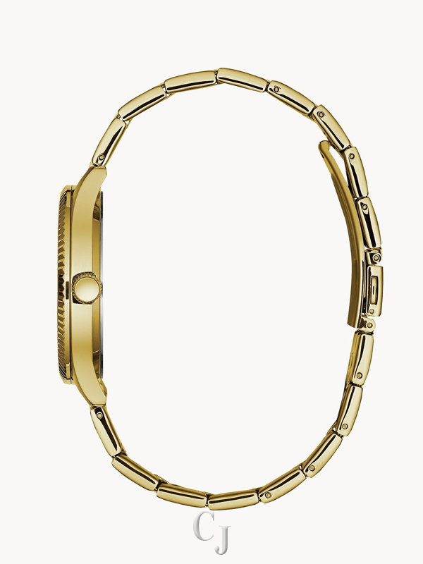 Sleek and streamlined in stainless steel with gold finish, serrated-edge bezel, black dial, luminous hands, calendar, second hand, and double-pusher deployment buckle.