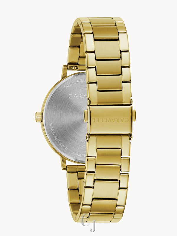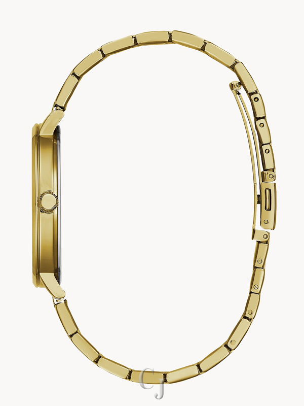 Go for maximum impact with minimalist design. Bold black dial accented with gold-tone hands and hour markers. Gold-tone stainless steel case and bracelet with double-push fold-over closure and quick-release spring bar.