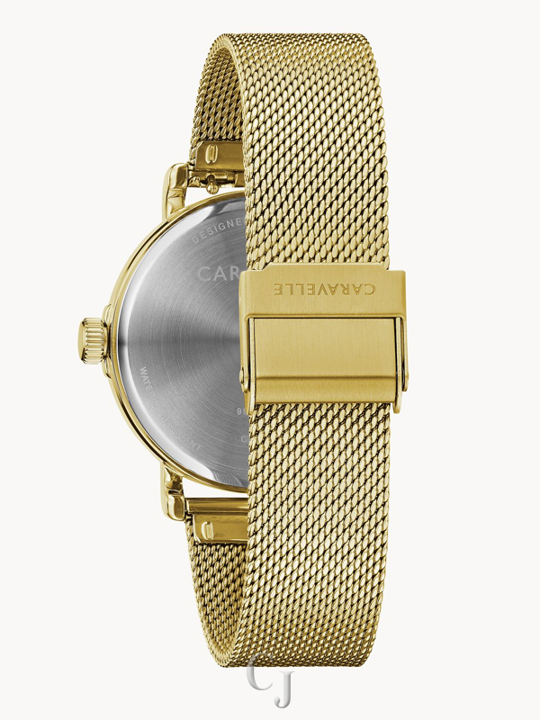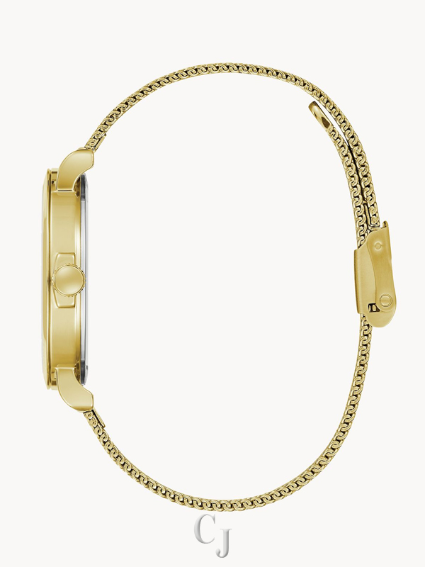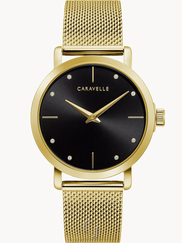 Refined design highlighting the precision of time keeping. Gold-tone stainless steel case and comfortable, easy to adjust mesh bracelet with sliding clasp closure. Minimalist black dial featuring eight crystals on the dial and gold-tone hands.