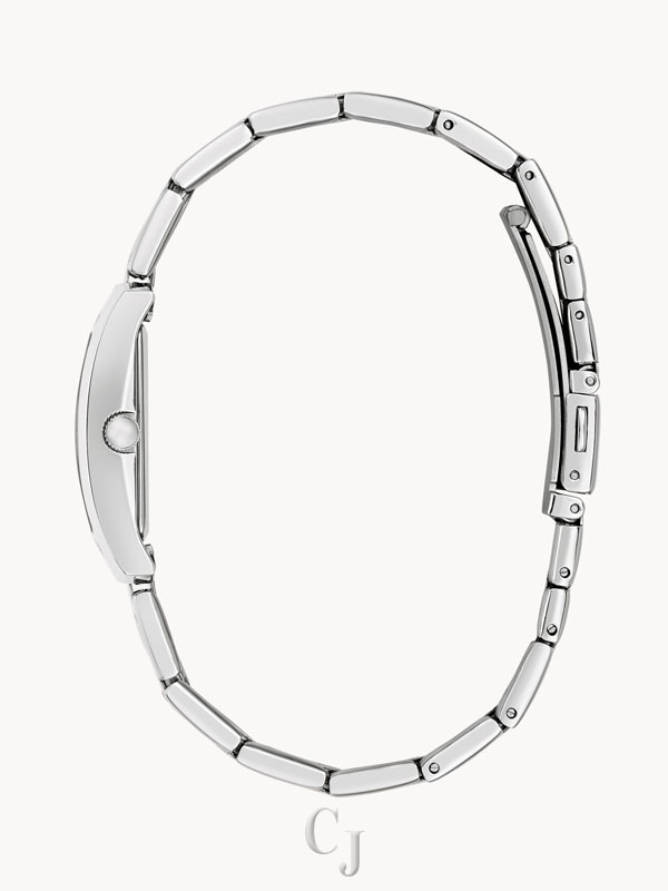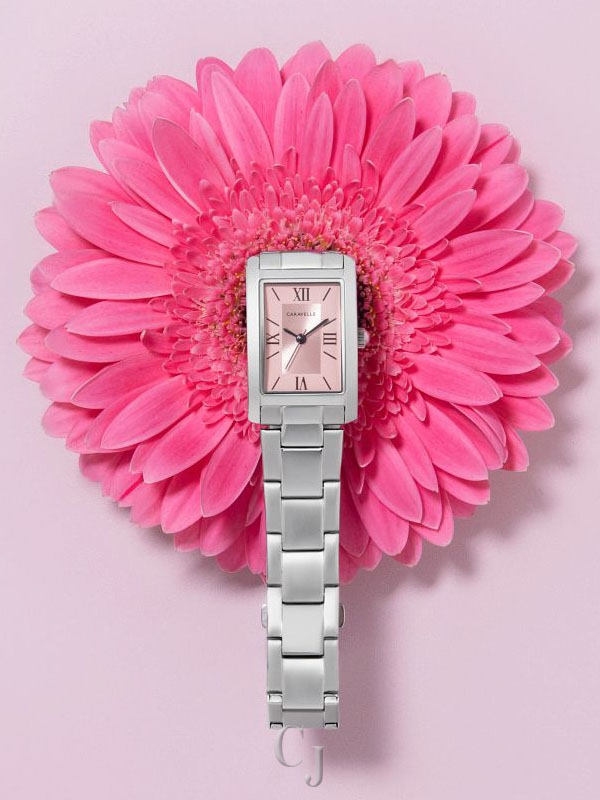 Look pretty in pink all year long with this charmingly elegant Caravelle women’s watch. At once bold and refined, the silver-tone stainless steel case is polished throughout while a curved mineral crystal maintains the stylish silhouette. Printed black Roman numeral and baton markers are complemented by black sword hands that provide stunning contrast against the radiant split-finish pink dial. The watch transitions seamlessly to the matching silver-tone bracelet, which features a push-button folding closure for exemplary comfort. An everyday essential that can be dressed up or down, this Caravelle ladies’ timepiece is the perfect addition to any collection.