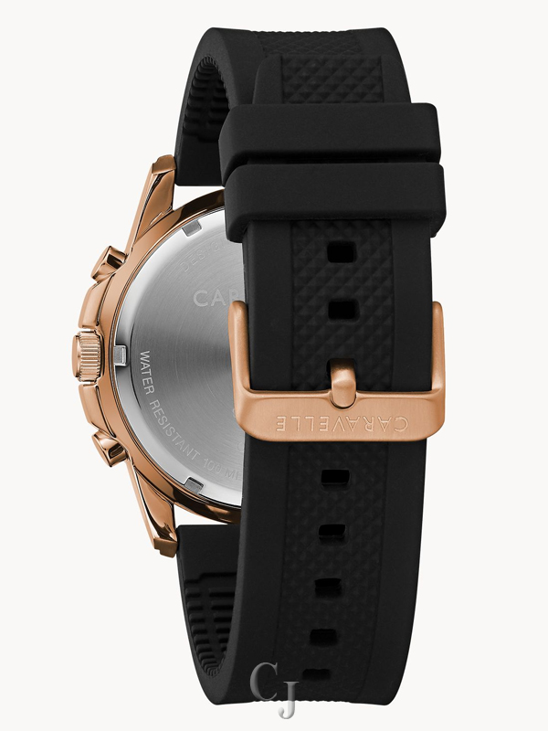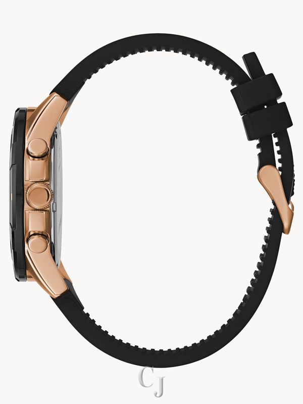Form and function, no compromise needed. Two-tone rose gold-tone stainless steel case with a uni-directional rotating black bezel. Black wave inspired dial texture with luminous hands and markers. Six-hand chronograph movement. Black silicone strap with three-piece wire closure.