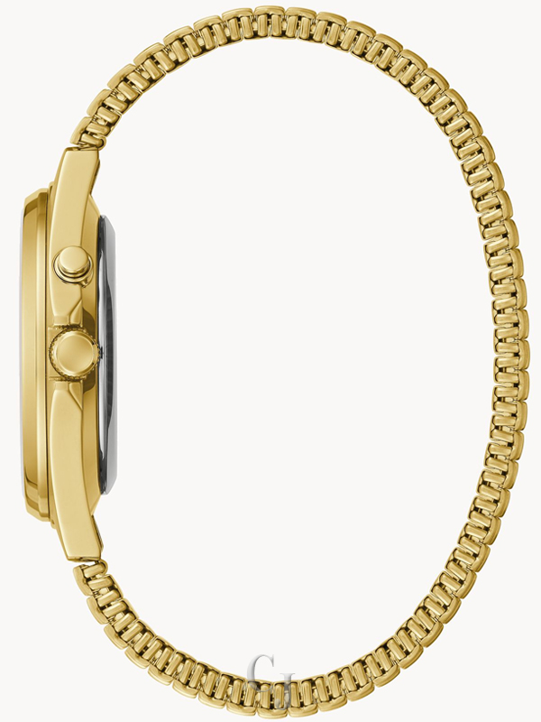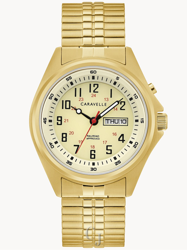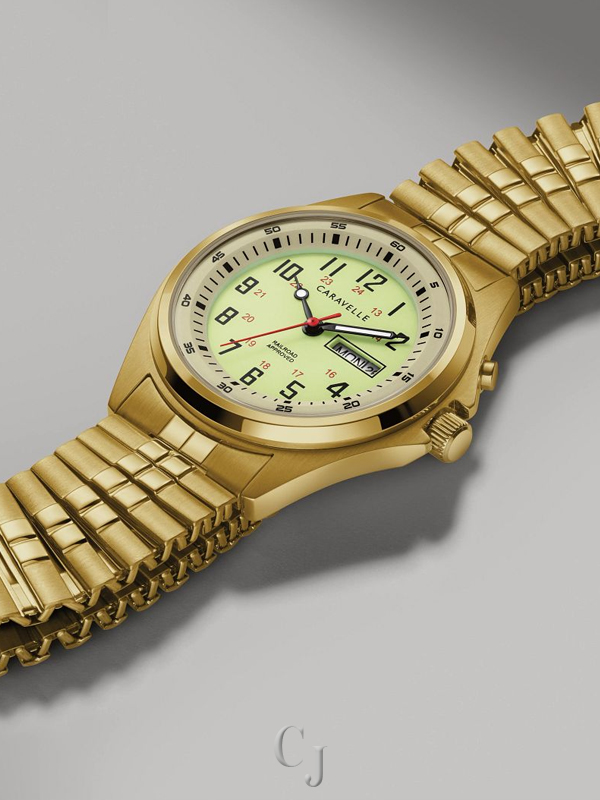 Simple, classic easy to read gets even easier to read…in the dark This style has a backlit feature that illuminates the dial and is activated with a pusher at 2 o’clock. Gold – tone stainless steel case with a full Arabic parchment colored dial also features a military time inner track, day/date window, and luminous hands. Stainless steel expansion band bracelet for easy styling.