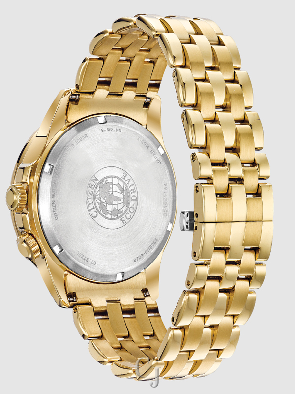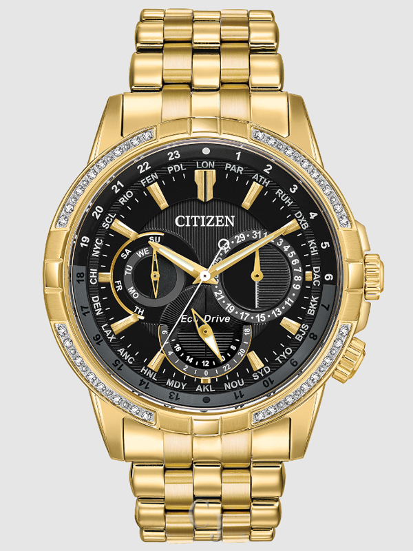 Bring sophistication to your day with the CITIZEN Calendrier. This timeless watch features world time in 24 time zones. Men’s watch featured with gold-tone stainless steel case and bracelet with black dial adorned with a diamond bezel. Featuring our Eco-Drive technology – powered by light, any light. Never needs a battery. Caliber number 8729.