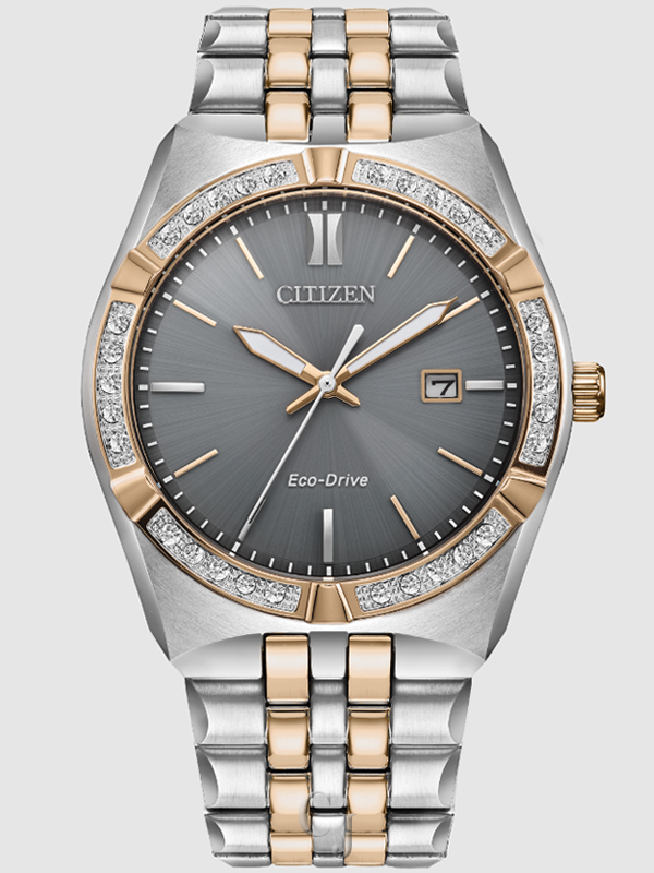 A classic timepiece is always in style in the latest addition to the Corso collection, where timeless elegance and modern technology meet. This elevated men’s watch is accentuated by a silver and rose gold-tone stainless steel 40mm case and a distinct diamond-set bezel that holds a gray three-hand dial with date. An integrated two-tone steel bracelet completes the look, securing the timepiece to the wrist. This Eco-Drive watch is sustainably powered by any light source, eliminating the need for a battery, and is water resistant up to 100 meters. Caliber E111.