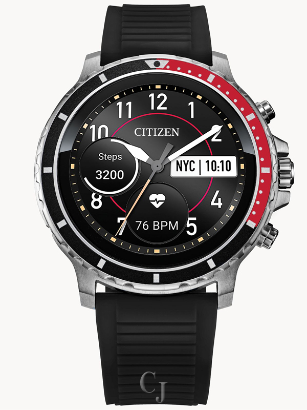 Citizen CZ Smart touchscreen smartwatch is designed for every moment. Inspired by the rich design of Citizen’s iconic sport technical timepieces, CZ Smart marries modern technologies with the style and quality you expect from Citizen. The sport edition features a color touchscreen dial and black anodized aluminum top ring, framed and finished with a silver-tone stainless steel case and comfortable black silicone strap. CZ Smart also features a 46mm three-piece case construction and a rugged red bezel design. Powered with Wear OS by Google™, CZ Smart is compatible with both iPhone® and Android™ phones to fit your lifestyle. Plus, the versatile menu of dials, designed exclusively for CZ Smart, gives you all the information you need at your fingertips. Please note: complimentary bracelet sizing is unavailable for CZ Smart due to the sealed packaging.