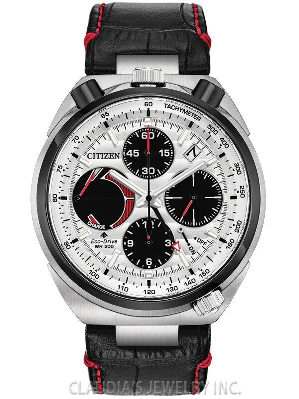 Paying homage to a retro 1973 CITIZEN Bullhead model, the newly modernized CITIZEN Tsuno Chrono Racer showcases a unique case styling, trendy color combinations and is sure to stand out on your wrist. A hand assembled movement, the Tsuno Chrono Racer features 1/5-second chrono, alarm, tachymeter, instantaneous fly back, power reserve and date. Seen here in a black ion-plated stainless steel case, black leather strap with red constrast stitching and black and silver dial. Featuring our Eco-Drive technology – powered by light, any light. Never needs a battery. Caliber number E210.