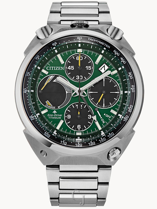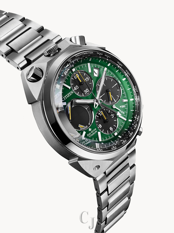 The Promaster Tsuno Chrono Racer from CITIZEN is a limited-edition timepiece with high style. The watch features a Super Titanium™ band and case, as well as a green dial with yellow accents. It has a hand-assembled movement, chronograph, alarm and a power reserve indicator. Like other watches in the Promaster line, it is water resistant up to 200 meters. The piece is also powered by light — any light — using Eco-Drive Technology.