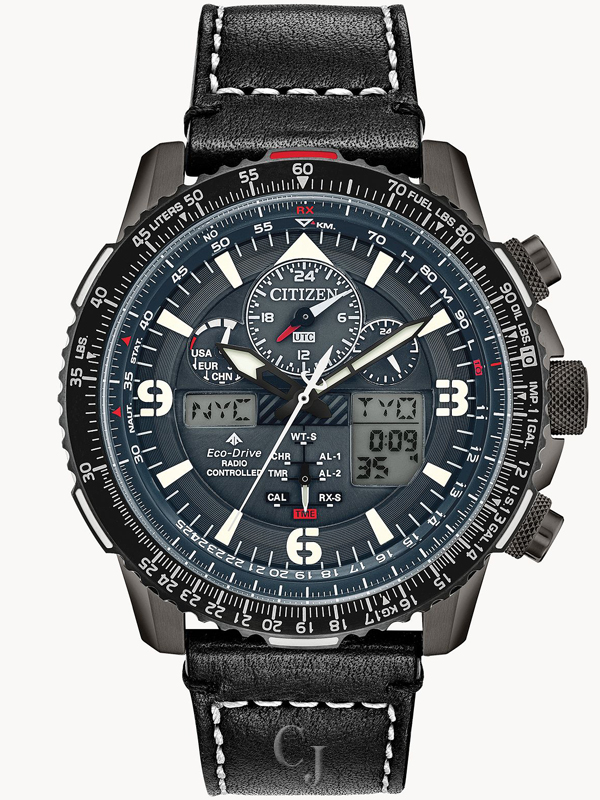 Redefining atomic timekeeping with a turbine inspired bold and powerful timepiece. The newest limited edition watch in the CITIZEN Promaster Skyhawk A-T collection is remarkably dynamic and visually appealing. With atomic timekeeping is 43 cities, this chronograph watch features a perpetual calendar, dual time, alarms, countdown timer, digital backlight and UTC displays, power reserve and pilot’s rotating slide rule bezel. This model appears with a grey-tone stainless steel case and luxurious black leather strap with contrast stitching and grey/green dial with unique case and dial motifs. Featuring our Eco-Drive technology – powered by light, any light. Never needs a battery. Caliber number U680.