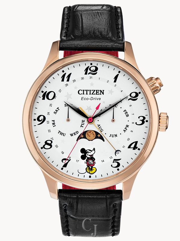 If you can dream it, you can wear it. The Disney Mickey Mouse watch collection by Citizen lets you wear a piece of the dream every day. Featured here in a rose gold-tone stainless steel case and sleek black leather strap. A handsome white dial is accented with Mickey Mouse himself, moon phase and analog month/day/date display. Featuring Eco-Drive technology – Citizen watches are powered by any light, and never need a battery. ©Disney
