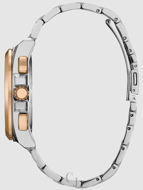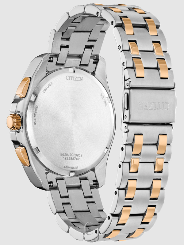 Make a distinctive style statement with the new Citizen men’s dress watch from the Classic collection. The two-tone stainless steel case holds the silver-tone dial with a 1/5 second chronograph that measures up to 60 minutes, 12/24-hour, time and date. The sleek dial is finished with a sapphire crystal. The two-tone stainless steel bracelet band has a fold over clasp with push buttons, giving the timepiece an understated refinement. This Eco-Drive watch is powered by any light source, eliminating the need for batteries, and is water resistant up to 100 meters. This professional-looking timepiece provides the wearer with lasting style and top performance.