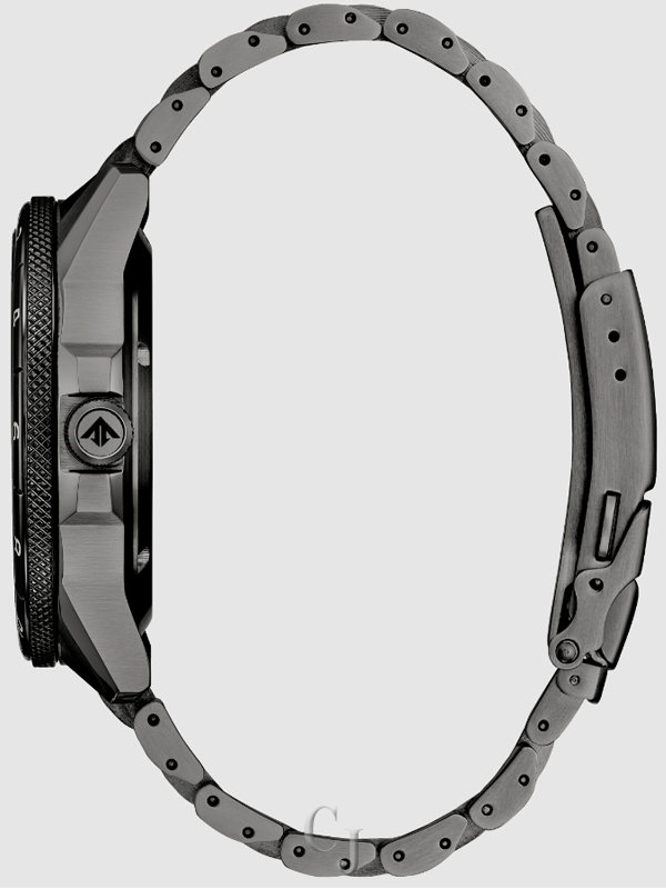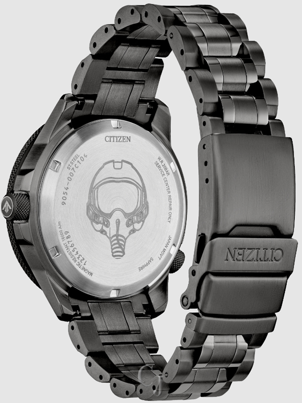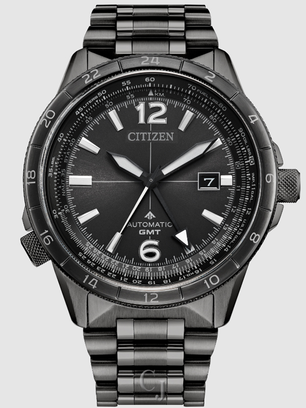 Purpose takes flight with the Promaster Air Automatic GMT, the latest addition to our professional Promaster Air collection with new mechanical movement. Measuring 44.5mm on the wrist and water resistant up to 200m, the new flight-ready timepiece is a mission-focused powerhouse, featuring a sturdy construction in gray ion-plated stainless steel with a 24-hour bezel and two bold crowns to match. On its pilot-style dial, high-performance luminous hands and markers contrast against a black background for quick legibility. An aeronautical slide-rule scale surrounds the display and is operated by a 7 o’clock crown, while a 3 o’clock date window and red-accented GMT hand showcase daily and travel utility. Inside the new Promaster Skyhawk is the Citizen Caliber 9054, a reliable automatic mechanism featuring a 50-hour power reserve, accurate to -10 / +20 seconds per day, and magnetically resistant up to 16000 A/M.