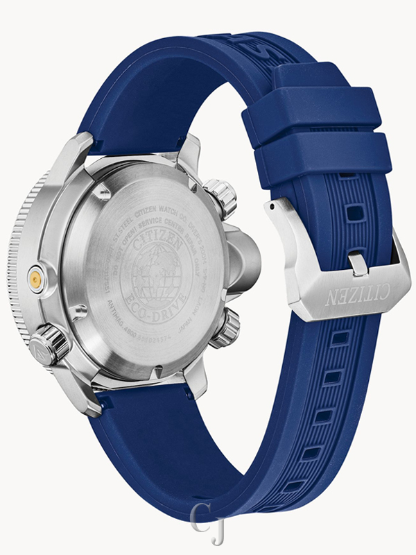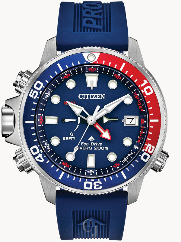 Ready, Set, Dive. An iconic name with a reinvented construction, the Citizen Promaster Aqualand ISO compliant watch with maximum depth memory, rapid ascent alarm, auto start dive mode and power reserve indicator with divers 200M, you won’t want anything else when headed to the ocean. Stainless steel case compliment the ocean blue polyurethane strap and blue dial with blue and red bezel. Featuring our Eco-Drive technology – powered by light, any light. Never needs a battery. Caliber number J250.