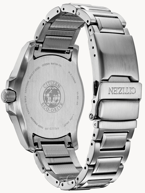 Test the extremes with the brand new CITIZEN Promaster Tough series. Living up to its name, this timepiece features a monocoque case (2 piece construction resulting in no caseback) resulting in extreme rigidity, shock resistance and anti-magnetism. Super Titanium™ coating on a stainless steel case and bracelet allowing for anti-rust, scratch resistance, hypo-allergenic and 5X harder than stainless steel. Other features include anti-reflective sapphire crystal, super LumiNova hands and markers and ability to function in extreme temperatures. Featuring our Eco-Drive technology – powered by light, any light. Never needs a battery. Caliber number E168. * LumiNova® is a registered trademark of NEMOTO & CO.,LTD.