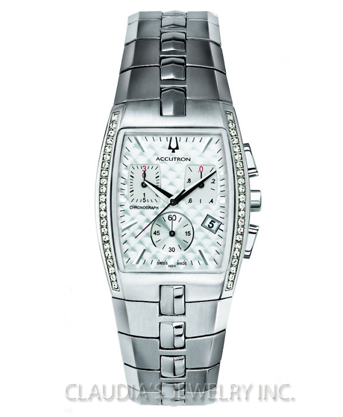From the Accutron Watches, Accutron Lucerne Diamond Collection, 44 white diamonds set on bezel. Chronograph. Domed sapphire crystal. Luminous hands and markers. Four screw case back. Stainless steel case and bracelet. Deployment buckle and closure with lock. Water resistant 30M. Approximate case diameter/width 30mm.