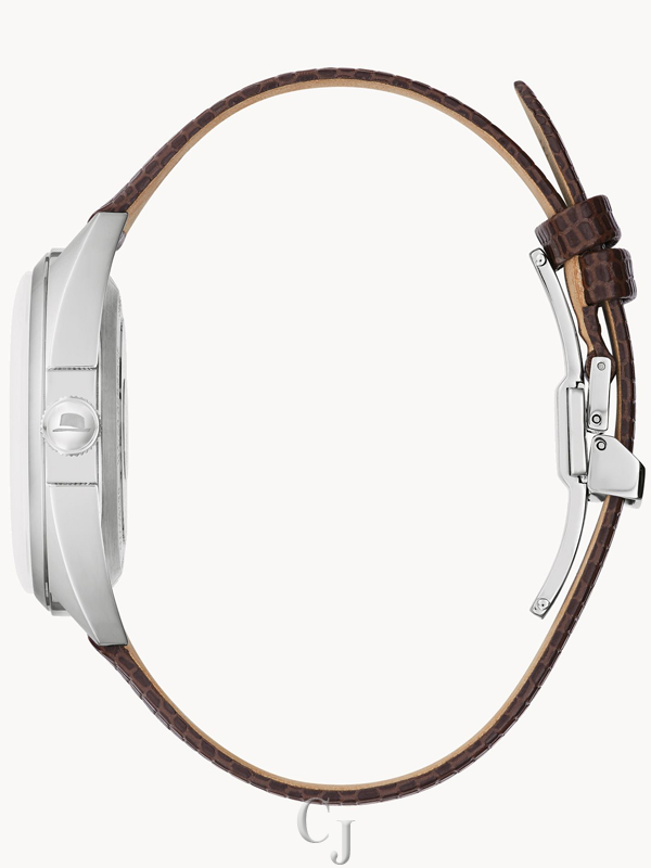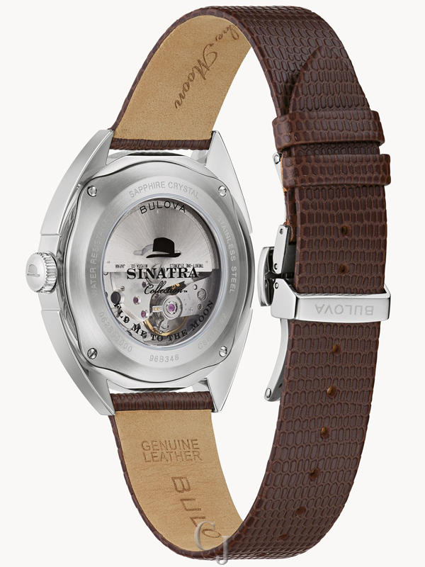 Incorporating vintage Bulova designs with the unmistakable elements of legendary performer, Frank Sinatra, the ‘Fly Me To The Moon’ watch features a stainless steel case with gold-tone vintage style hands and markers. Frank Sinatra’s signature is displayed elegantly on the textured black dial. The watch features a Miyota Caliber 8215 21-jewel automatic movement with a 42-hour power reserve and calendar. The exhibition case back showcases the fine movement and features the song title as well as the iconic Fedora Hat, which can also be found etched on the crown. The brown lizard grain textured leather strap features a deployant buckle and is stamped with the name ‘Fly Me To The Moon’ along the inside. The watch features a domed sapphire crystal with AR coating and water resistance to 30 meters.