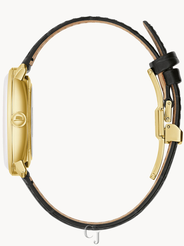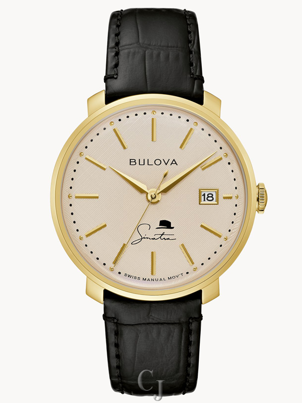 Incorporating vintage Bulova designs with the unmistakable elements of legendary performer, Frank Sinatra, ‘The Best Is Yet To Come’ watch features a gold-tone stainless steel case and gold-tone hands and markers. Frank Sinatra’s signature and iconic Fedora Hat are displayed on the elegantly textured parchment colored dial. Staying true to the era, the watch features a Swiss made Sellita Caliber SW215 19-jewel manual wind mechanical movement with a 42-hour power reserve and calendar. The exhibition case back showcases the fine movement and features the song title as well as the iconic Fedora Hat, which can also be found etched on the crown. The black crocodile textured leather strap features a deployant buckle and is stamped with ‘The Best Is Yet To Come’ along the inside. The watch features a domed sapphire crystal with AR coating and water resistance to 30 meters.