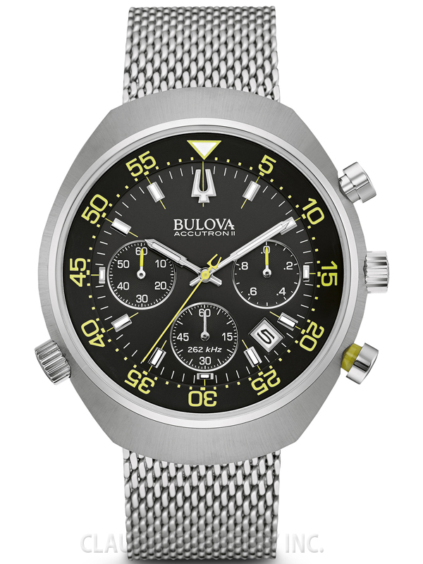 From the Lobster Collection. Chronograph. Stainless steel case and bracelet, double-curved mineral glass box crystal, black dial, luminous hands, calendar, second hand, screw-back case, and double-press deployant closure. Powered by Bulova’s exclusive high performance quartz movement with a frequency of 262 kHz for unparalleled accuracy.