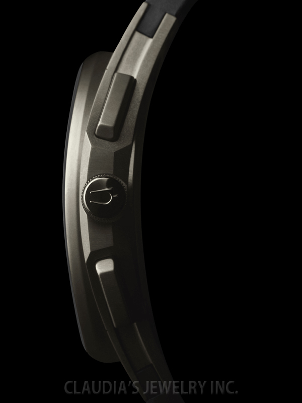 Men’s Curv Chronograph WatchFrom the new CURV Collection. The world’s first curved chronograph movement features high-performance quartz technology with 262 kHz vibrational frequency for precise accuracy. Five-hand chronograph in titanium and stainless steel case, dark grey exhibition dial with rose gold-tone accents, exhibition screw-back case, curved sapphire glass with black metallization on the outer crystal, black rubber strap with 3-piece buckle closure, and water resistance to 30 meters.