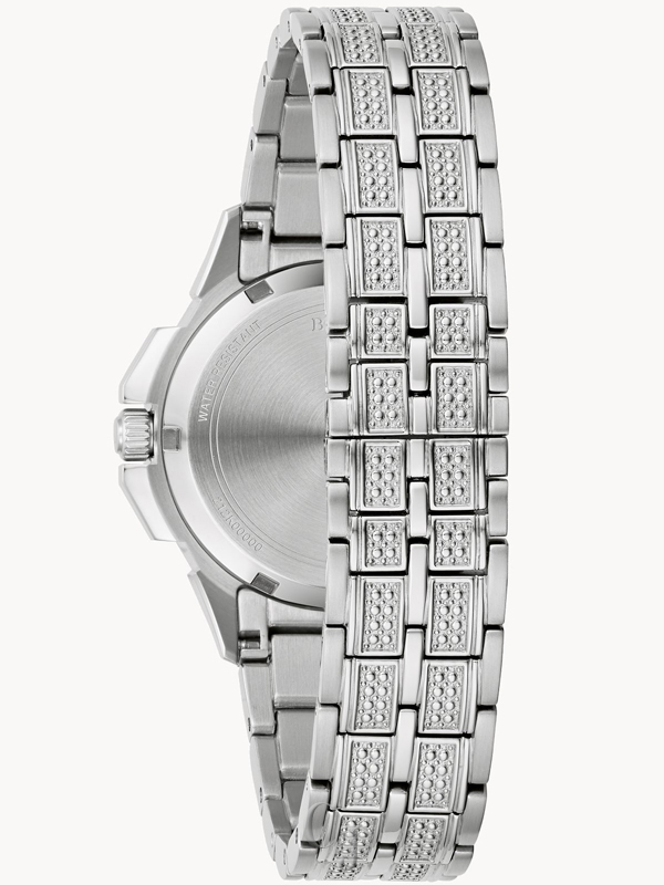 Make a striking style statement with the Bulova mid-size dress watch from the Octava Crystal collection. The silver-tone stainless steel case is set with the embellished silver-white and full pave 3-hand dial and features 345 sparkling hand-set crystals that adorn the timepiece and complete the bold look. The silver-tone stainless steel bracelet has a deployant buckle with pushers for easy fastening. This exquisite watch will enhance your day to evening look and make a refined statement.