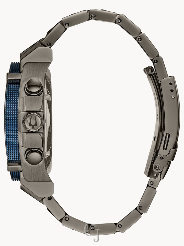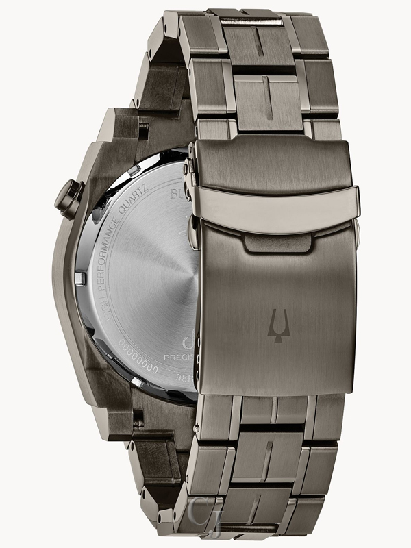 Powered by Bulova’s proprietary Precisionist eight-hand quartz chronograph movement with a 262kHz vibrational frequency—eight times greater than standard timepieces—for unparalleled accuracy. Gray and blue IP stainless steel case with black dial featuring orange accents, curved mineral crystal, gray stainless steel bracelet with fold-over buckle closure, safety bar and extender. 300-meter water resistance.