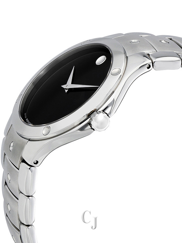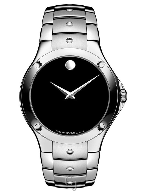 Movado Sports Edition Men’s Watch 0605788. Stainless steel case with a stainless steel bracelet. Fixed stainless steel bezel. Black dial with silver-tone hands. No markers. The signature Movado dot appears at the 12 o’clock position. Dial Type: Analog. Quartz movement. Scratch resistant sapphire crystal. Solid case back. Case size: 38 mm. Case thickness: 9.5 mm. Round case shape. Band width: 24 mm. Hidden deployment clasp. Water resistant at 30 meters / 100 feet.