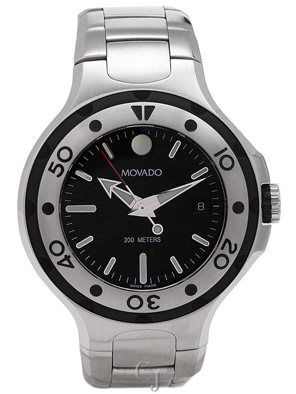 Movado Series 800 Collection Black Dial, stainless steel Mens Sport watch Model# 2600001 features a black engraved wave patterned dial set with silver tone & luminous hand indicators, luminous Movado signature dot & index hour markers, Second Hand, Date display at the 3 o’clock position, Stainless Steel & Rubber Uni-directional Rotating Divers Bezel & a Scratch Resistant Sapphire Crystal.Water resistant to 200 meters/660 feet. The signature Movado Dot appears at the 12 o’clock position.