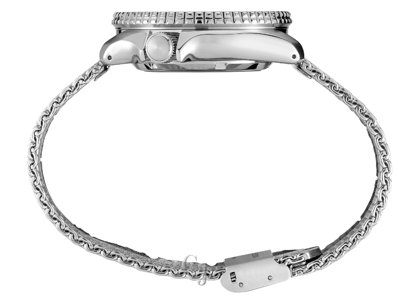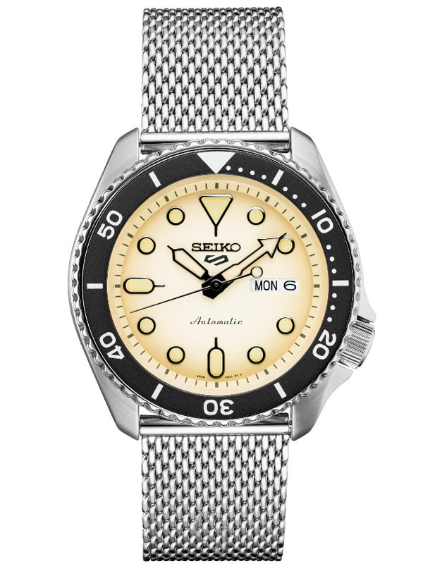 Seiko 5 Sports, Manual and automatic winding capabilities, 21,600 vibrations per hour, Power reserve: approximately 41 hours, 24 jewels, Antique off-white dial with black accents, Black unidirectional rotating bezel, Day/date calendar, LumiBrite hands and markers, Case diameter: 42.5mm, Stainless steel case and mesh bracelet, Water-resistant to 10 bar, 100 meters (300 feet), Caliber 4R36